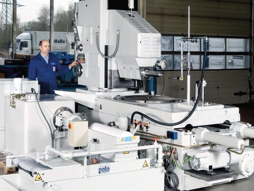Eine der wichtigsten und wertvollsten Maschinen war besonders stark betroffen: eine Universal-Schleifmaschine mit der Modellbezeichnung RF pe B80, die üblicherweise als Flachschleif- und Bohrungsschleifmaschine in einer Aufspannung eingesetzt wird. Sie dient der hochpräzisen Bearbeitung von Teilen bis 1.200 mm Durchmesser für besondere Anwendungen in der Lohnfertigung.