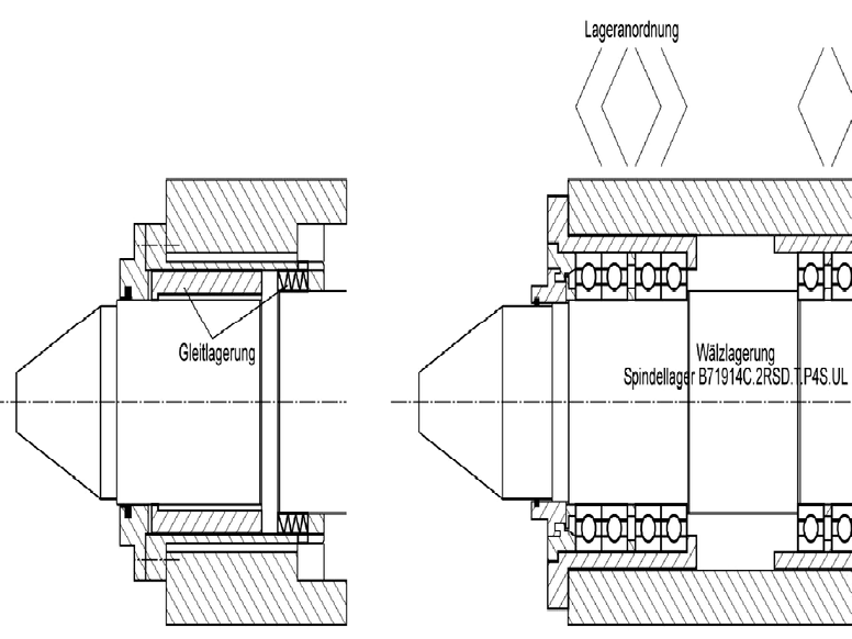 Mit dem Austausch der Spindel wurde auch das Lagersystem geändert: Das Gleitlager wurde durch ein Wälzlager ersetzt. Die Bronzelegierung der Rundtischbuchse musste durch Drehen ausgehöhlt, metallisiert, geschliffen und schließlich eingeschabt werden.