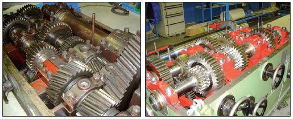 Allein vom Getriebe waren 90% der Zahnräder nicht zu retten und mussten erneuert werden. Die verbliebenen hochwertigen Zahnräder konnten nachverzahnt werden. Auch der Schaltschrank musste erneuert werden. Da sämtliche Einstellungen an der Maschine manuell auszuführen sind, musste der neue Schrank allerdings nur wenige Funktionen abdecken.